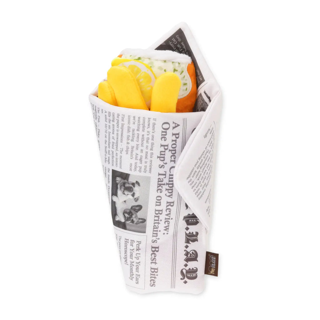 Detachable crinkly fish and squeaky fries wrapped in a soft, playful newspaper that are perfect for fetch, chomps and curious chewers