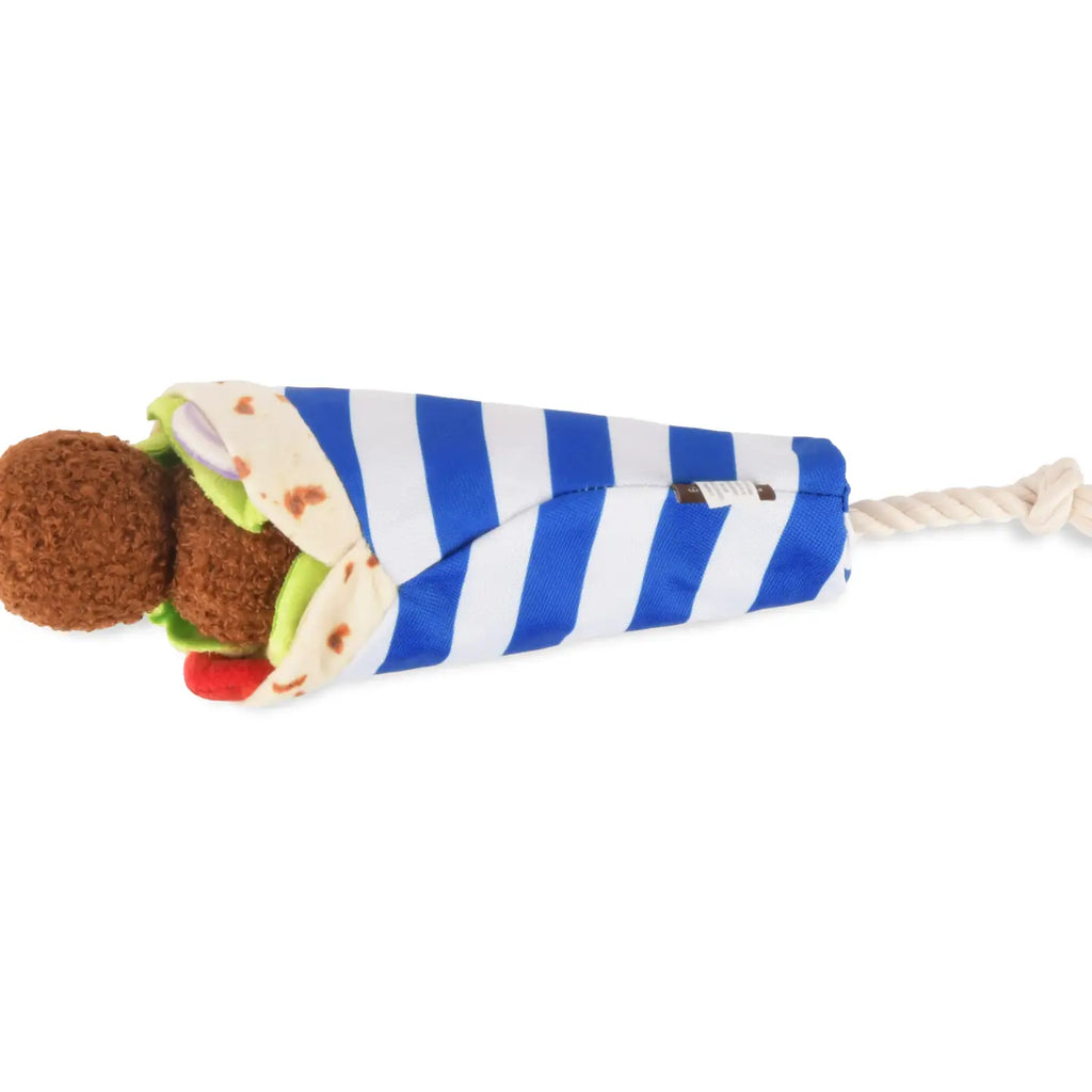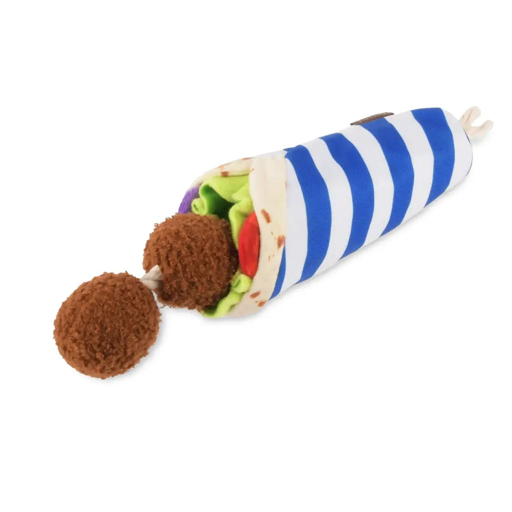 Inspired by the flavors of the Middle East, P.L.A.Y.’s International Classic Fur-lafel Wrap is stuffed with playtime flavor. With two squeaky meatballs on a sliding rope, crinkly veggie layers and room to stash treats inside, this plush toy delivers endless tugging, twisting and squeaking fun for dogs with a taste for global adventure.