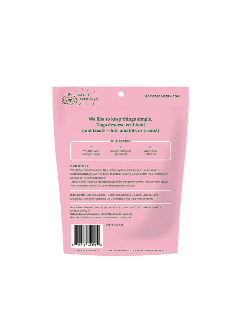 Ingredients: Oat Flour, Apples, Rolled Oats, Coconut Glycerin, Cheese, Molasses, Flaxseed, Vegetable Oil, Cinnamon, Citric Acid (Preservative) Guaranteed Analysis: Protein: 10% Fat: 7% Fiber: 2% Moisture: 23%